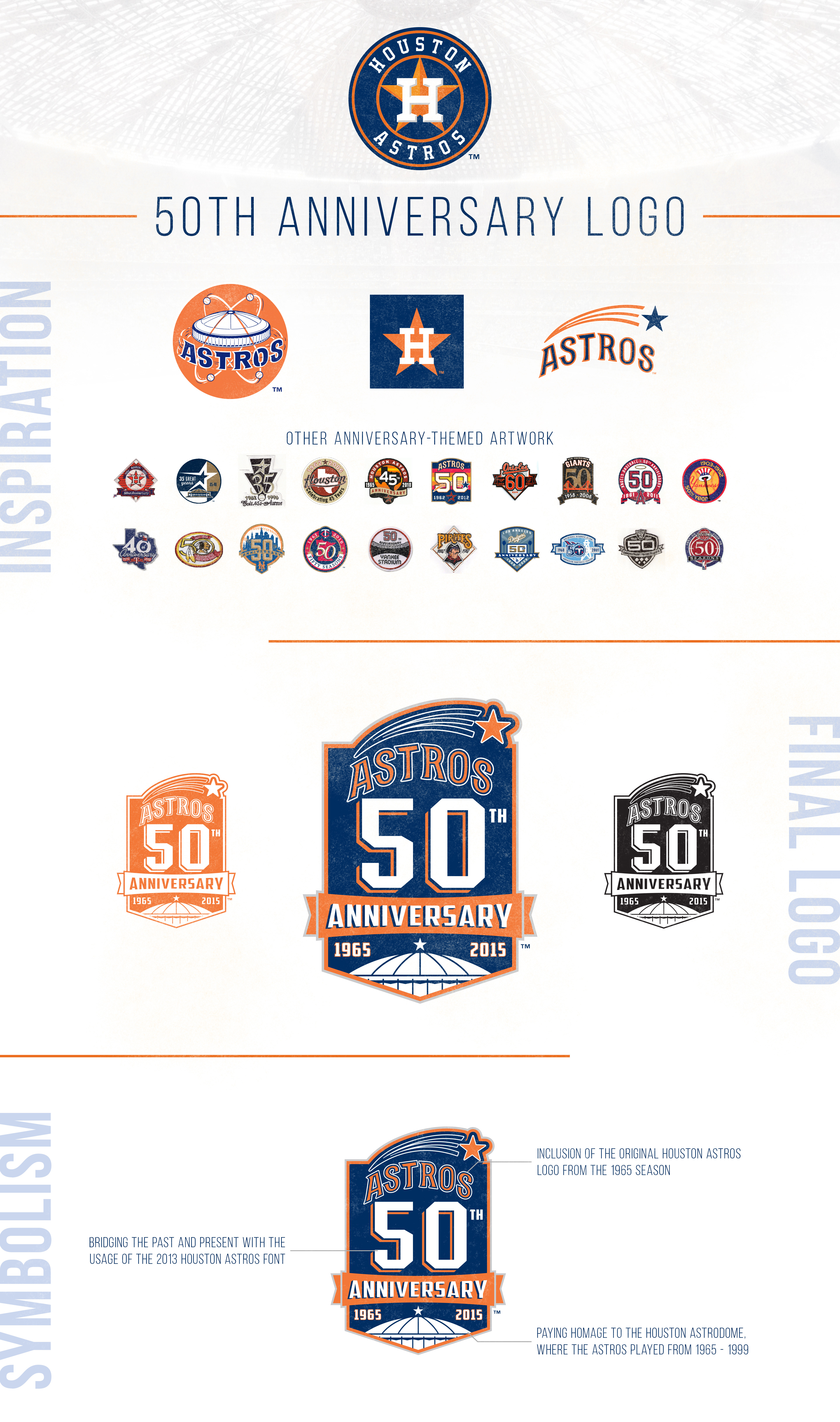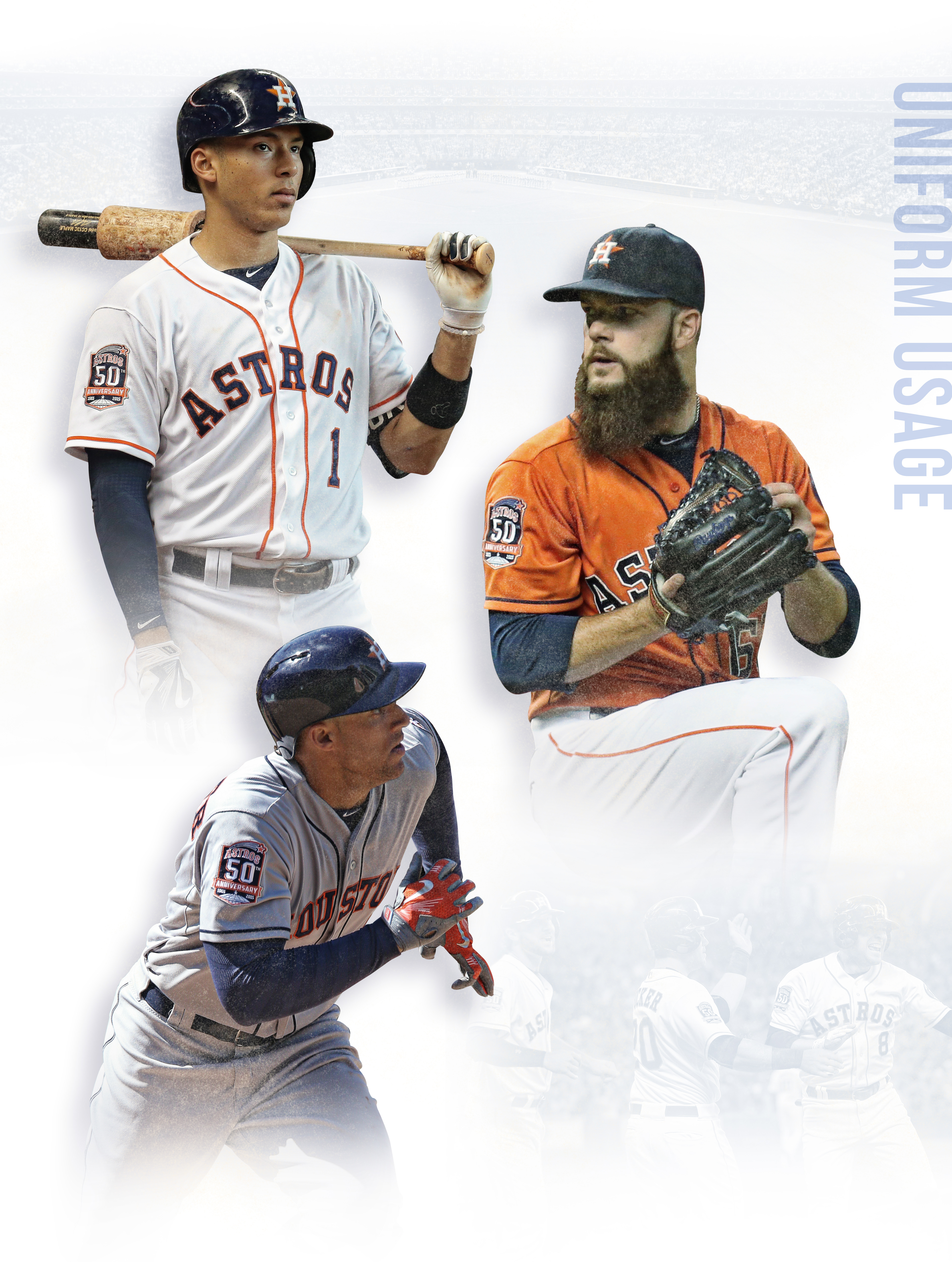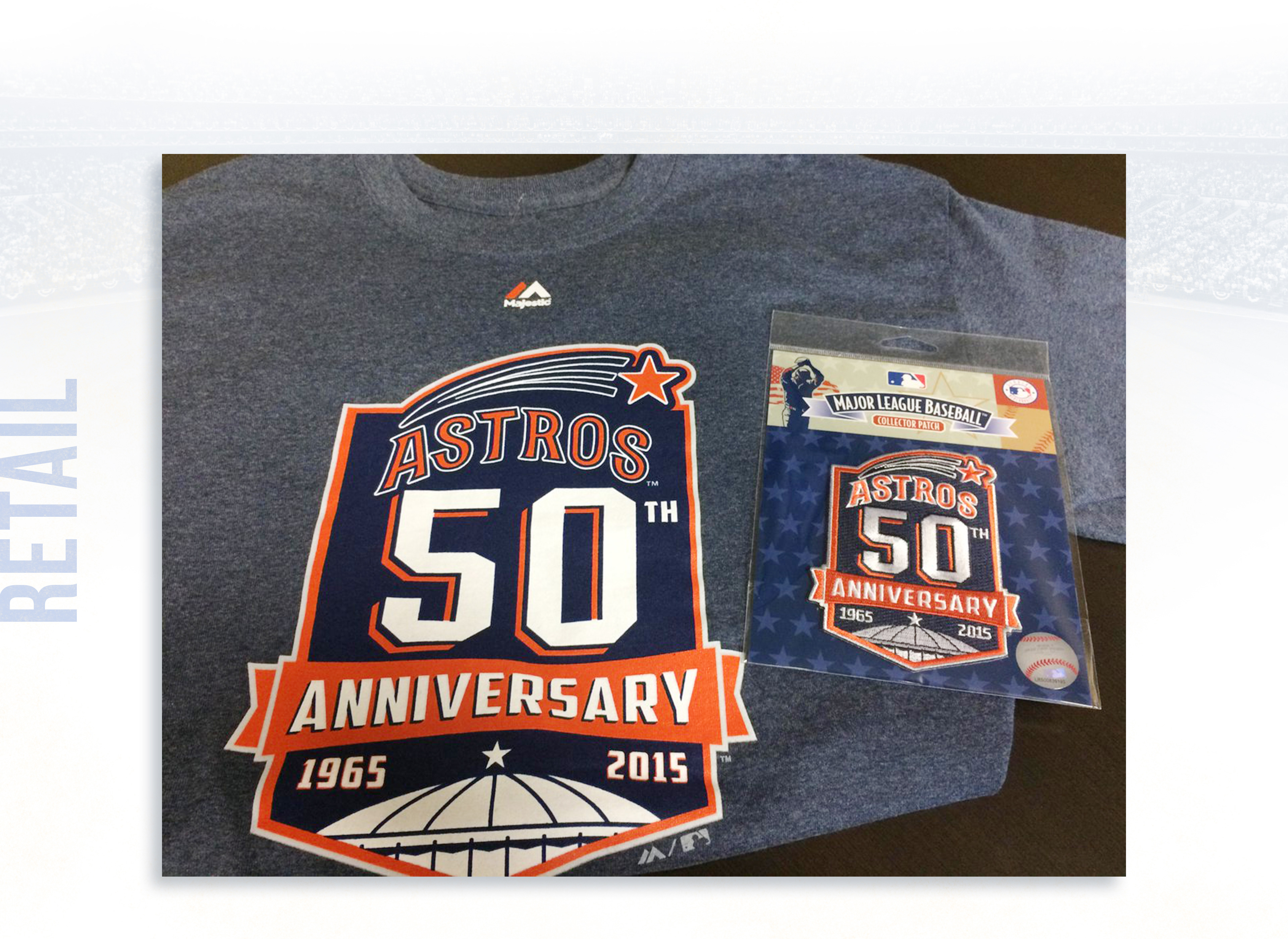 During the 2015 season, the Houston Astros celebrated their 50th Anniversary commemorating the change of the franchise’s name to "Astros" from "Colt .45s." To commemorate the year, the team wore 50th Anniversary patches for all regular season games.