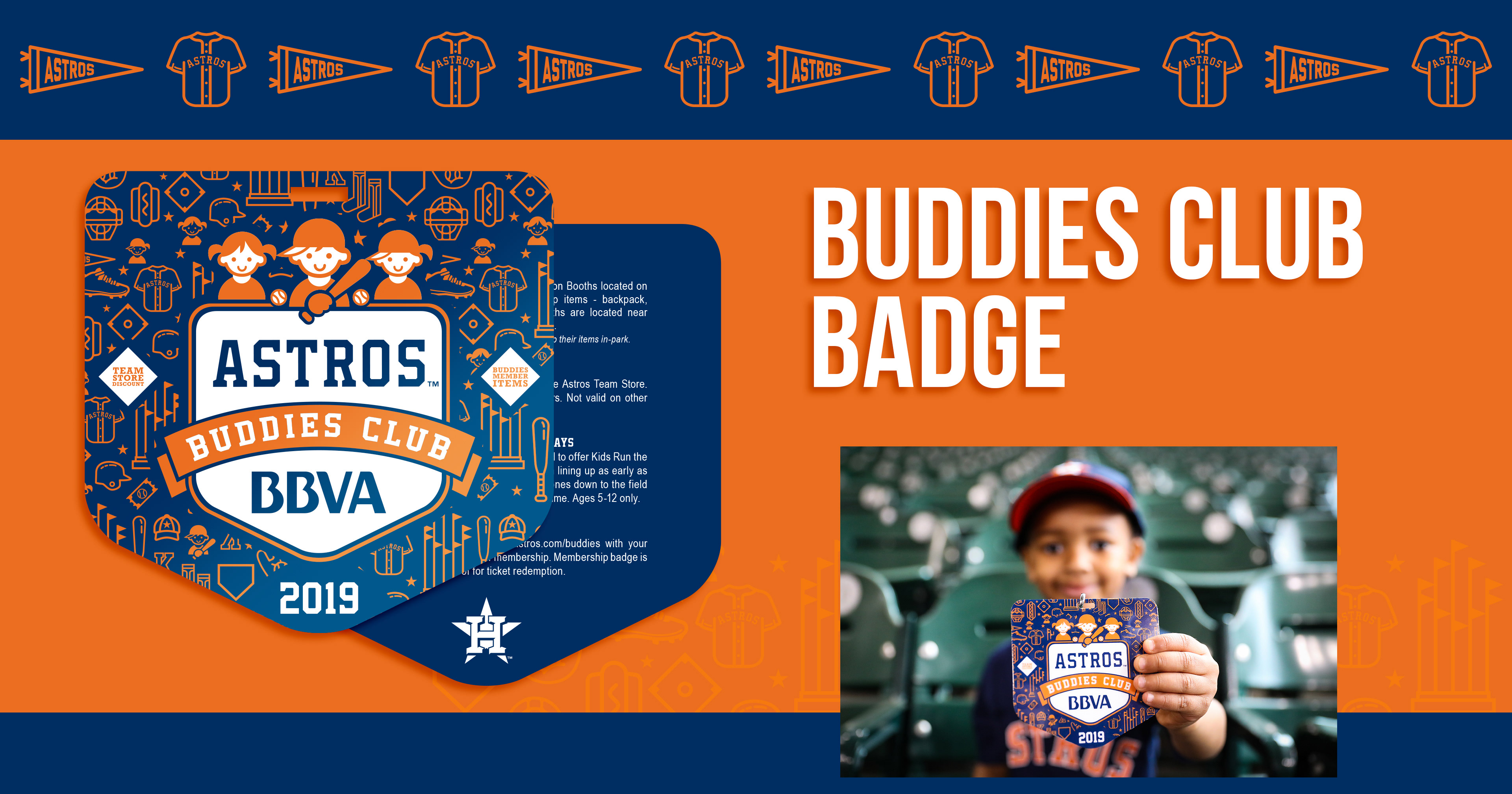 2019 Astros Buddies Club Campaign. This consisted of a backpack, hat, socks and badge given to the Astros Buddies upon signup. The collateral also included web ads, digital signage and printed pieces.