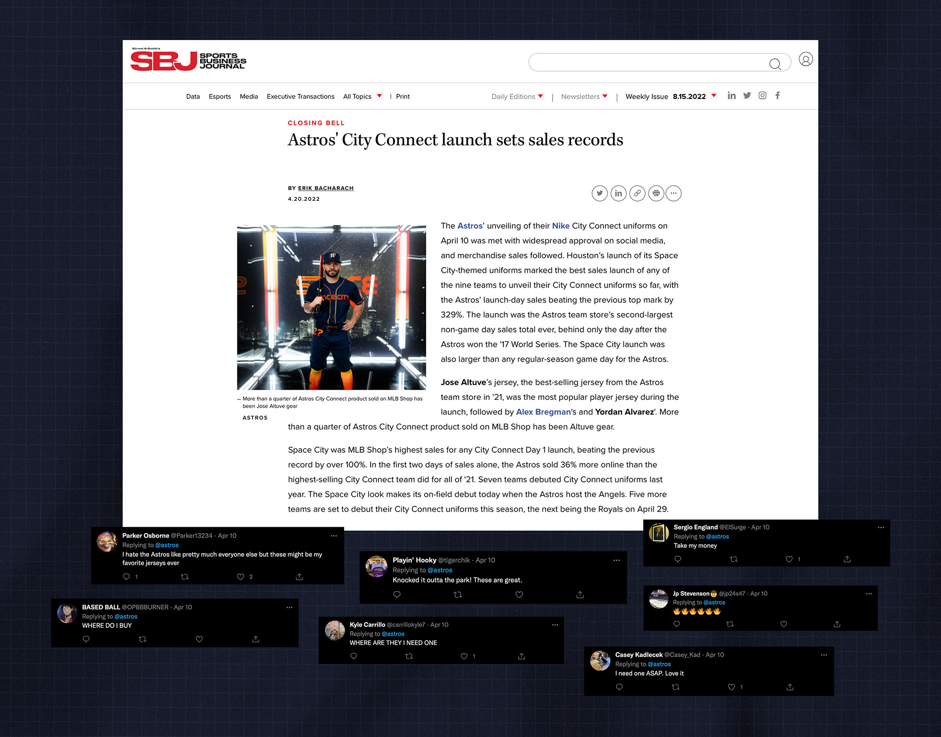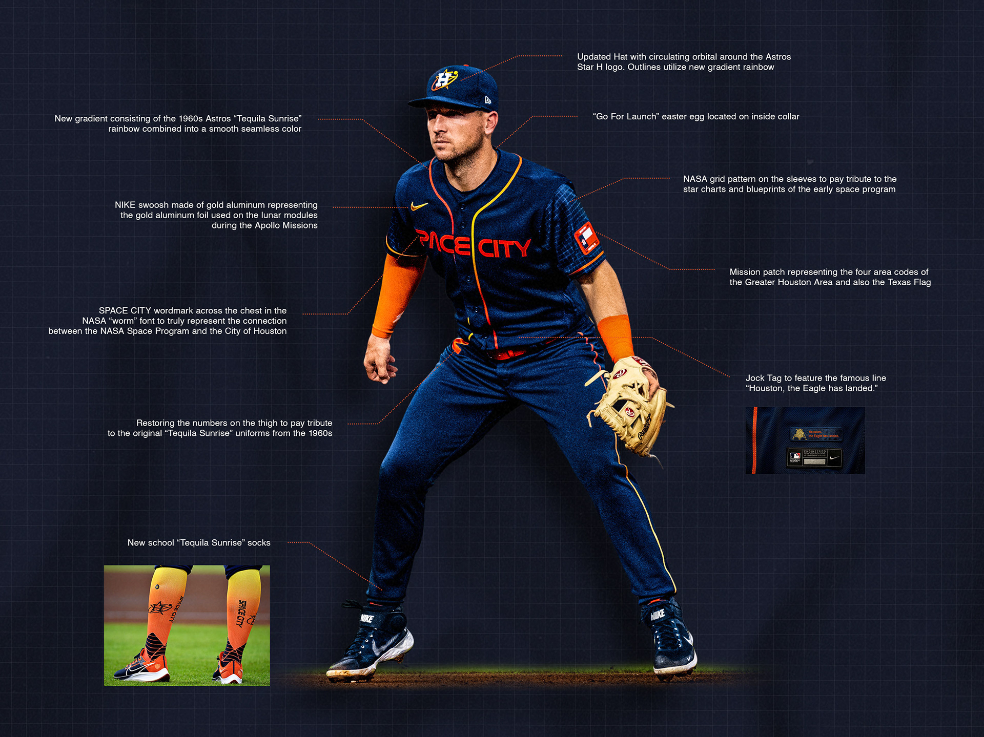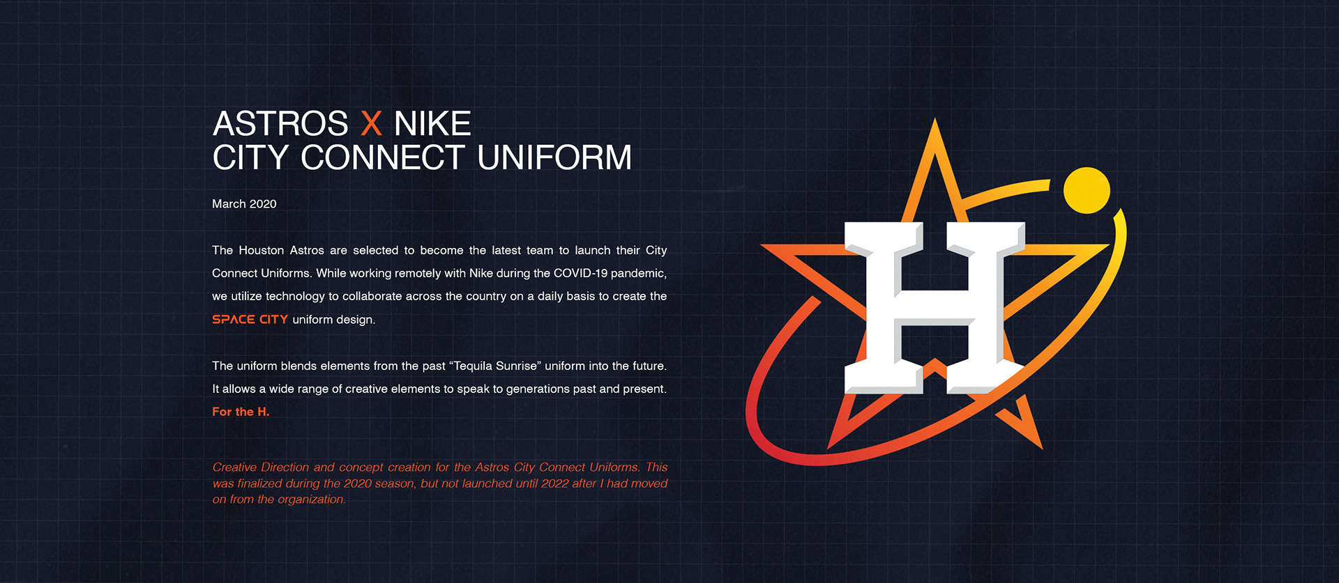 The Nike City Connect Uniform for the 2022 Houston Astros. This project was completed in 2020 during the COVID-19 pandemic, but the launch was delayed until the 2022 MLB Regular Season.